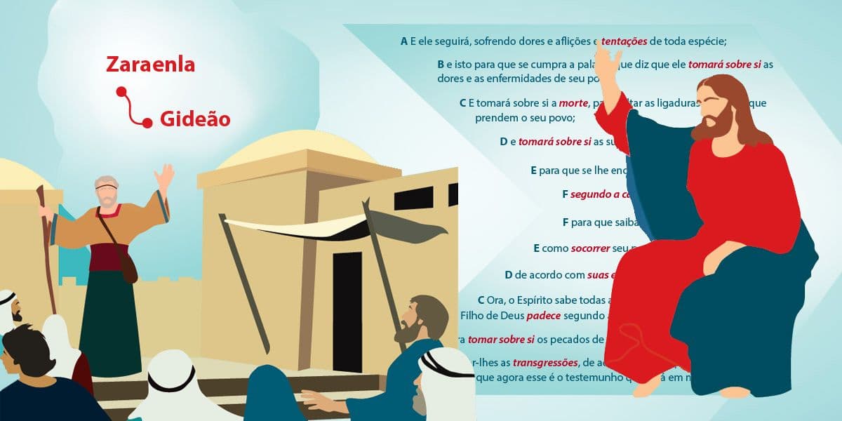 Quando Alma visitou a cidade de Gideão, ficou feliz ao descobrir que o povo vivia em retidão (Alma 7:5-6, 17-20). Por causa de sua justiça, Alma foi autorizado a compartilhar com eles verdades importantes sobre o sacrifício expiatório do Salvador que ele não havia compartilhado em Zaraenla. Alma começou ensinando sobre o nascimento do Filho de Deus (Alma 7:10),1 e depois ensinou que o Salvador iria "sofre[r] dores e aflições e tentações de toda espécie; e isto para que se cumpra a palavra que diz que ele tomará sobre si as dores e as enfermidades de seu povo" (Alma 7:11, ênfase adicionada). Como visto em português, a tradução em inglês parece indicar que Alma estava citando ou aludindo a Isaías 53:4, que fala com mais precisão de "dores" e "enfermidades" em hebraico, em vez de "griefs" (pesares) e "sorrows" (tristezas) como encontrado na Bíblia do Rei Jaime. Ou seja, as palavras de Alma na tradução original em inglês do Livro de Mórmon estão mais próximas do hebraico do que a versão de Joseph Smith da Bíblia.2 Quando Alma testificou sobre o Salvador, ele organizou seus pensamentos em um quiasmo — uma forma literária em que palavras-chave, frases ou ideias são repetidas na ordem inversa.