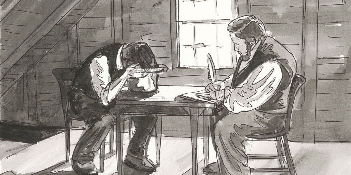 Joseph Smith dá a Martin Harris as 116 páginas do manuscrito. Imagem via lds.orgEsta proposta é baseada em uma leitura cuidadosa de Palavras de Mórmon,2 combinada com evidências do manuscrito do impressor. Uma das coisas mais confusas sobre Palavras de Mórmon é que parece terminar no meio: o versículo 11 diz: "E sei que serão preservadas, porque grandes coisas estão escritas nelas, pelas quais meu povo e seus irmãos serão julgados no grande e último dia, segundo a palavra de Deus que está escrita."3