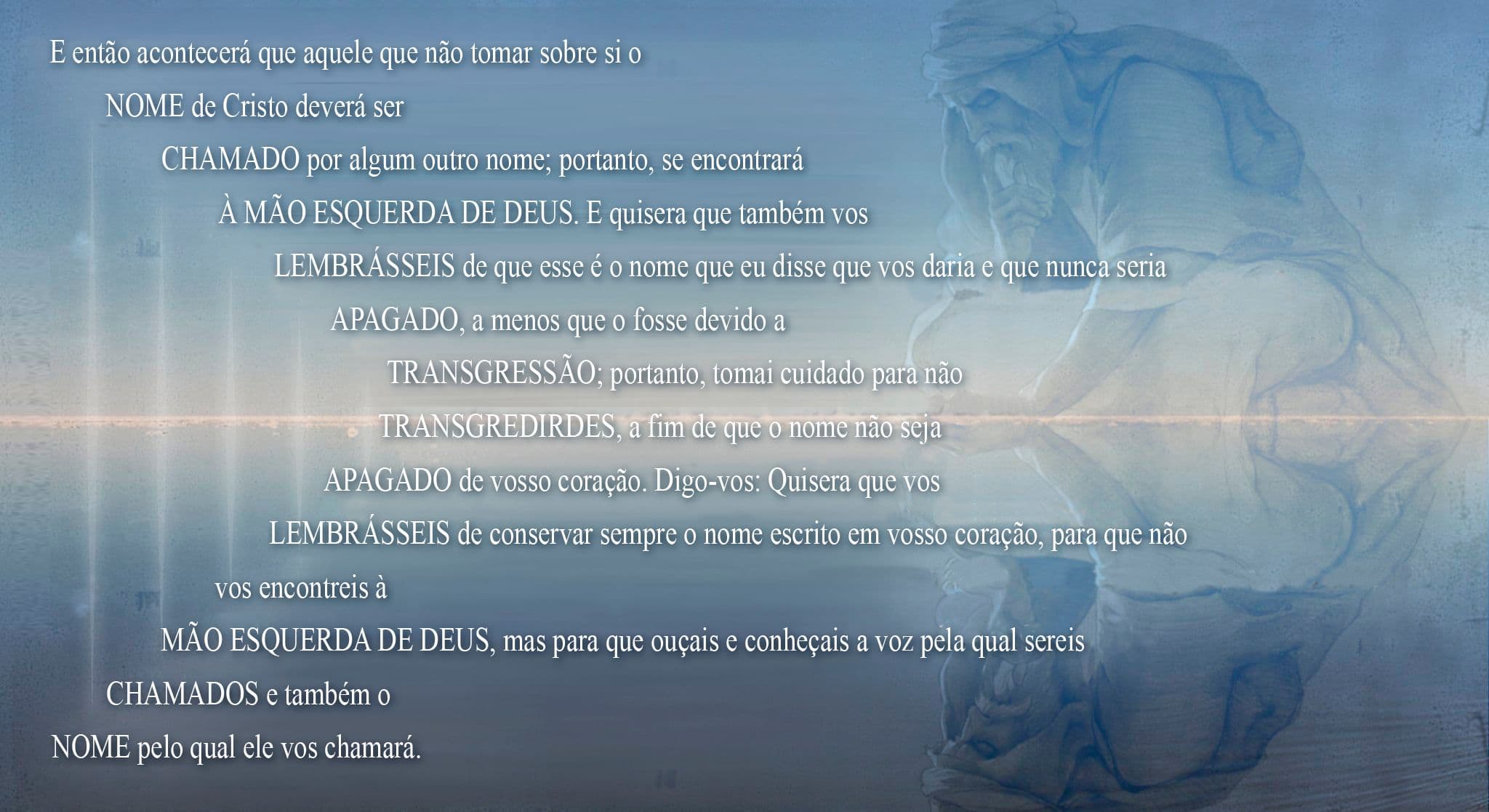 "[E]sse é o nome que eu disse que vos daria e que nunca seria apagado, a menos que o fosse devido a transgressão; portanto, tomai cuidado para não transgredirdes, a fim de que o nome não seja apagado de vosso coração. Digo-vos: Quisera que vos lembrásseis de conservar sempre o nome escrito em vosso coração, para que não vos encontreis à mão esquerda de Deus" Mosias 5:11–12