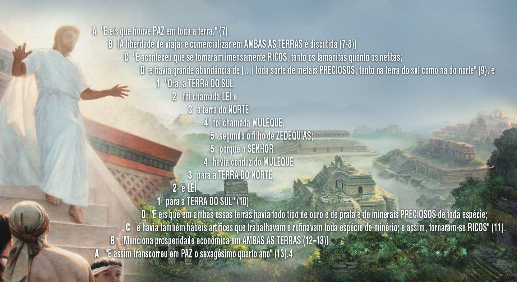 John L. Sorenson, "O Milagroso Livro de Mórmon", A Liahona, fevereiro de 2016, pp. 18-21, disponível online em: lds.org John L. Sorenson, "Mormon's Sources", Journal of Book of Mormon and Other Restoration Scripture 20, no. 2 (2011): pp. 2–15. John W. Welch, "A Steady Stream of Significant Recognitions", em Echoes and Evidences of the Book of Mormon, ed. Donald W. Parry, Daniel C. Peterson e John W. Welch (Provo, UT: FARMS and Brigham Young University, 2002), pp. 345–347.1. Ver Grant Hardy, Understanding the Book of Mormon: A Reader's Guide (New York, NY: Oxford University Press, 2010), p. 90: "Mórmon se dirige aos leitores de tempos em tempos ao longo do restante de sua história — adicionando um comentário, uma explicação ou uma interpretação — então somos regularmente lembrados de que estamos recebendo sua perspectiva particular, uma espécie de visita guiada, da civilização nefita". 2. John L. Sorenson, "Mormon's Sources", Journal of Book of Mormon and Other Restoration Scripture 20, no. 2 (2011): p. 4. 3. Detectado pela primeira vez em 1987. Ver John W. Welch, "Chiasmus in Helaman 6:7–13", em Reexploring the Book of Mormon: A Decade of New Research (Salt Lake City and Provo, UT: FARMS and Deseret Book, 1992), pp. 230–232. Ver também John W. Welch, "A Steady Stream of Significant Recognitions", em Echoes and Evidences of the Book of Mormon, ed. Donald W. Parry, Daniel C. Peterson e John W. Welch (Provo, UT: FARMS, 2002), p. 346: "Porque o quiasmo engloba o relatório completo do ano, essa estrutura unificadora sugere fortemente que o registro foi escrito como uma única unidade literária que Mórmon encontrou nas placas maiores de Néfi". 4. O formato é ligeiramente derivado de Welch, "Significant Recognitions", pp. 345–346. Para obter mais informações sobre quiasmos no Livro de Mórmon, consulte o artigo da Central do Livro de Mórmon, "Por que a presença de quiasmos no Livro de Mórmon é algo significativo? (Mosias 5:10–12)", KnoWhy 166 (21 de julho de 2017); Central do Livro de Mórmon, "Por que Alma foi convertido? (Alma 36:21)", KnoWhy 144 (24 de junho, 2017). 5. Welch, "Significant Recognitions", p. 346. Ver também John W. Welch, "Chiasmus in Helaman 6:7–13", pp. 230–232. 6. Welch, "Significant Recognitions", p. 347. 7. Deve-se notar que não apenas o centro desse quiasmo invoca o nome de Deus, mas no ponto onde o quiasmo inverte sua ordem, descreve o Senhor trazendo "Muleque para a terra do norte e Leí para a terra do sul" (Helamã 6:10). Em outras palavras, o versículo descreve explicitamente que a influência do Senhor levou esses grupos a suas respectivas terras, onde estavam naquela época experimentando paz e prosperidade. A inferência clara, então, é que o Senhor os estava levando à prosperidade. 8. Sorenson, "Mormon’s Sources", p. 12.Sobre prosperidade no Livro de Mórmon, consulte o artigo da Central do Livro de Mórmon "O que significa 'prosperar na Terra'? (Alma 9:13)", KnoWhy 116 (23 de maio de 2017). 9. Para um estudo mais aprofundado sobre este tópico, ver Hugh Nibley, The Prophetic Book of Mormon, The Collected Works of Hugh Nibley, Volume 8 (Salt Lake City and Provo, UT: Deseret Book and FARMS, 1989), pp. 504–508. 10. Welch, "Significant Recognitions", p. 347. 11. Welch, "Significant Recognitions", p. 347.